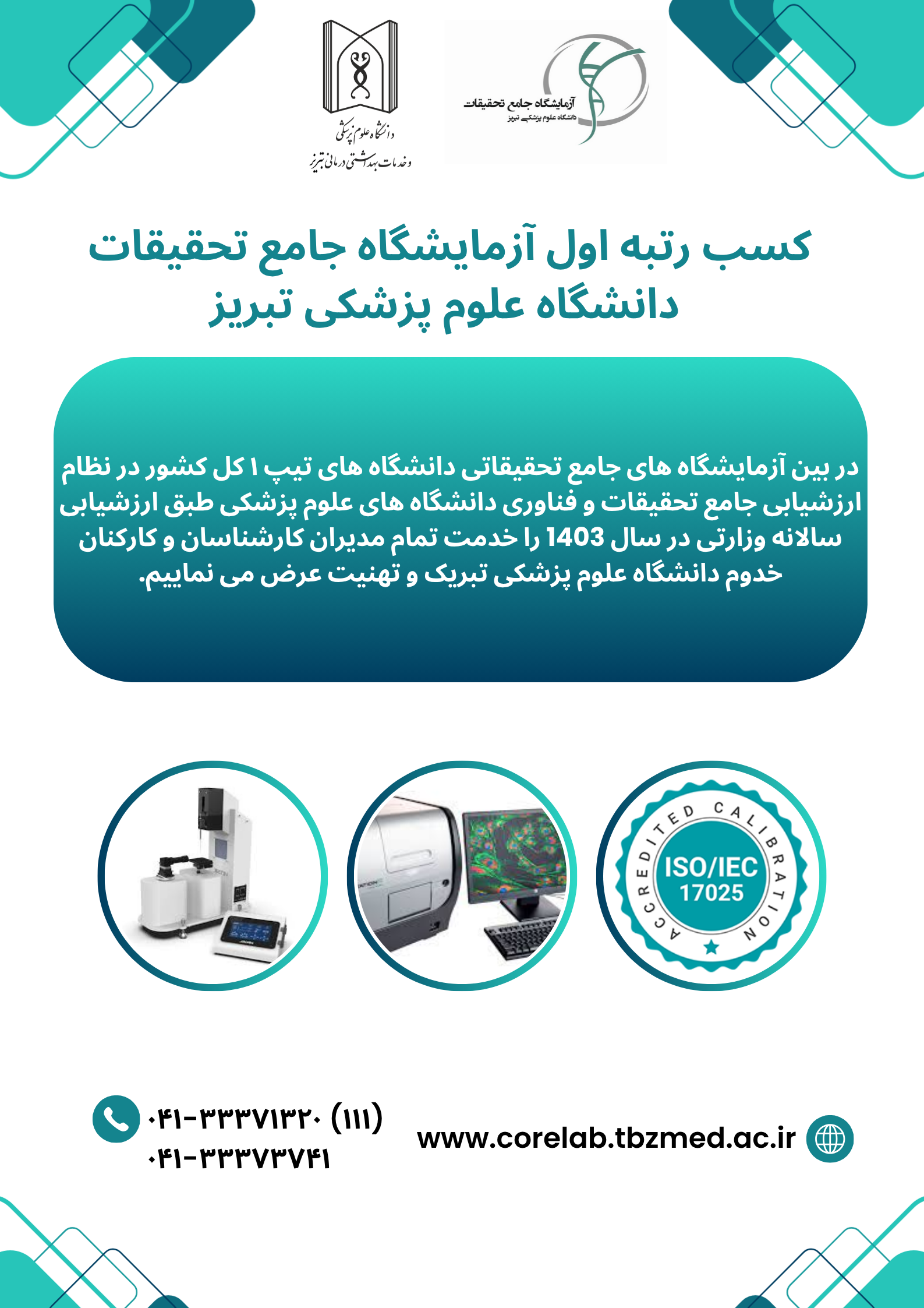 با افتخار اعلام می کنیم آزمایشگاه جامع تحقیقات علوم پزشکی تبریز در ارزشیابی سالیانه وزارتی رتبه نخست کشوری در بین تمامی آزمایشگاه های جامع تحقیقاتی تیپ 1 کشوری را کسب نموده است. این موفقیت مرهون تلاش بی وقفه تیم علمی ،فنی و اداری آزمایشگاه و حسن اعتماد همکاران و همراهان است. از همراهی شما سپاسگذاریم و متعهد به ارتقای مستمر کیفیت خدمات هستیم.